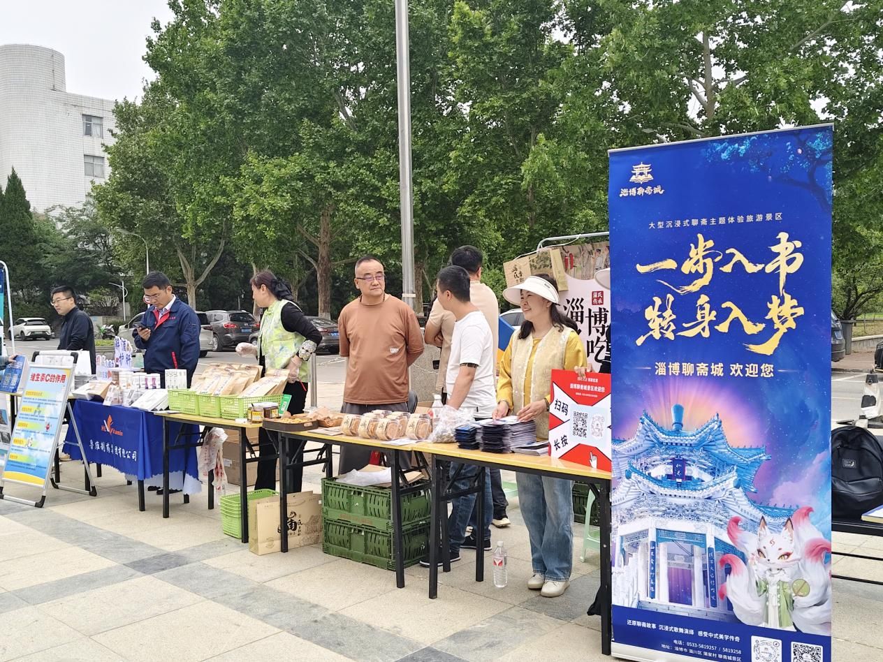 淄川区文旅局工作人员在广场设立了展示点位,通过宣传展板和物料陈列,向师生们展示了淄川区的丰富旅游资源。志愿者分布在活动入口、咨询台等关键点位,不仅协助发放景区门票,还耐心解答师生们关于景区特色和游览攻略的咨询,引导群众有序参与活动,确保了活动的顺利进行。他们还运用自己的专业知识,协助展示点位进行宣传,他们的专业态度和热情服务,不仅保障了宣传活动的平稳有序进行,也为文旅学子提供了实践锻炼的平台,深化了他们对地方文旅的了解与热爱。