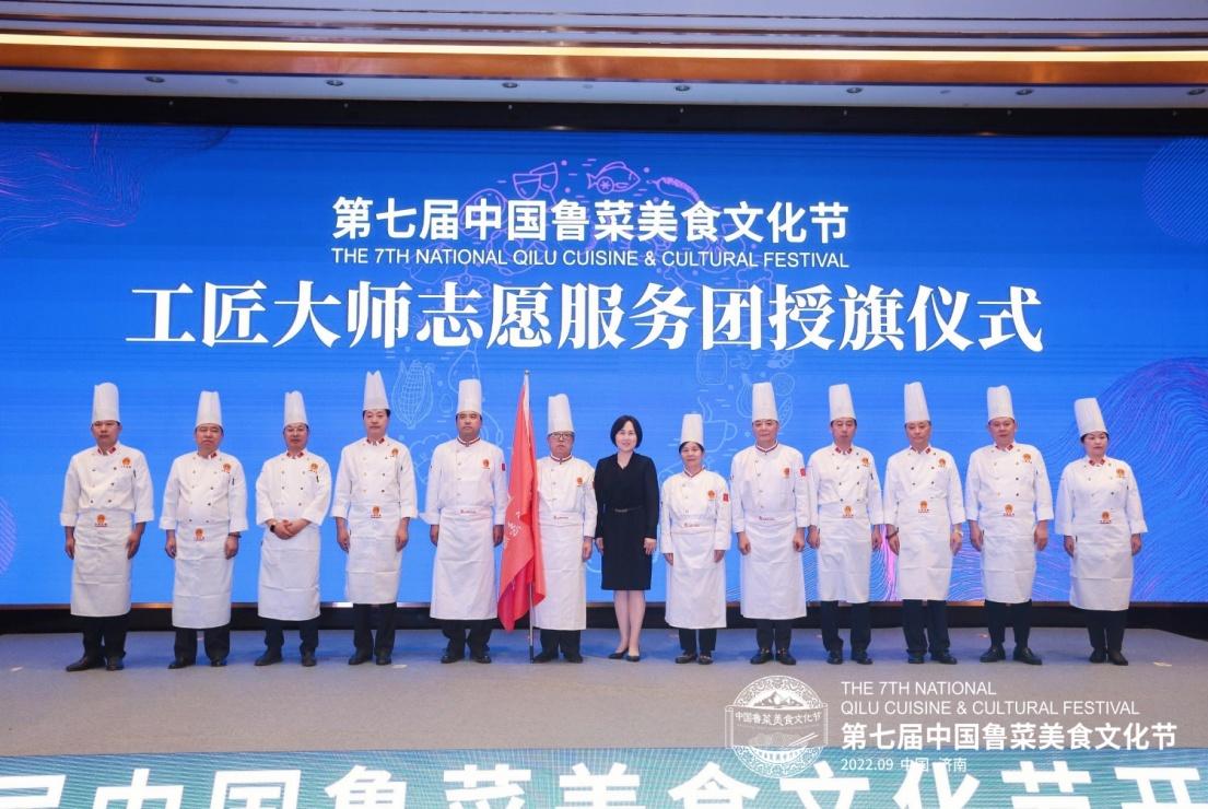 在本次中国鲁菜美食文化节启幕仪式上,由12名鲁菜大师组成的济南市饭店业协会“工匠大师志愿服务团”正式成立,并举行授旗仪式。该团队将在整个活动季过程中,积极参与志愿服务活动,联动不同社区举办线下活动,以弘扬鲁菜文化,倡导绿色健康生活为主题,在现场制作各款美食与百姓互动。除进社区外,还将走进校园现场为学生制作精美菜品或非遗技艺,讲解制作工艺,推动美食启蒙,定格鲁菜传承记忆。通过对话互动,强化鲁菜文化认知,传承工匠精神,引领培养“光盘行动”“公筷公勺”“节约餐饮”消费理念,倡导绿色消费新风尚。