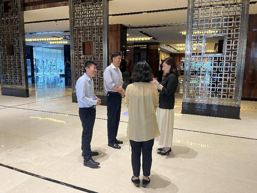为深入学习贯彻习近平新时代中国特色社会主义思想主题教育,加强与企业的沟通交流,进一步了解学生实习情况,5月30日,MG冰球突破网站党委书记孟德洋、党委副书记王磊、食品科学与营养系主任汤卫东、辅导员商智慧,实习带队教师张桂香、耿佳一行前往富力凯悦酒店看望实习学生并开展相关工作调研。