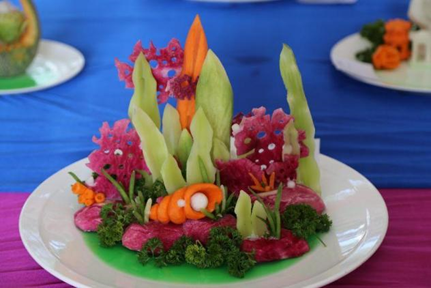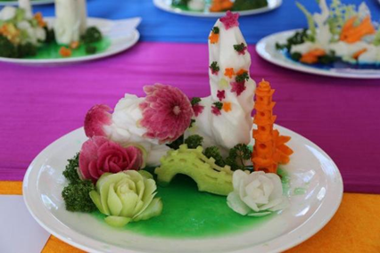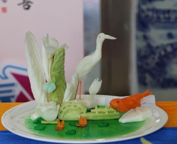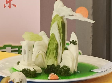 食品雕刻是一种造型艺术,是我国烹饪文化百花园中一枝奇葩,它化平凡为神奇,使宴席的面目一新,增添了宴席气氛,促进了宾客友谊,为宴席增添了不少情趣和色彩。青萝卜、胡萝卜、白萝卜、南瓜等原材料与直刀法、旋刀法、冷拼技术、盘饰艺术制成联结,雕刻上的花鸟鱼虫和文字,一笔一划尽显巧匠之风,每一个独立的个体在拼凑出一幅幅立体的画卷,富有诗意。