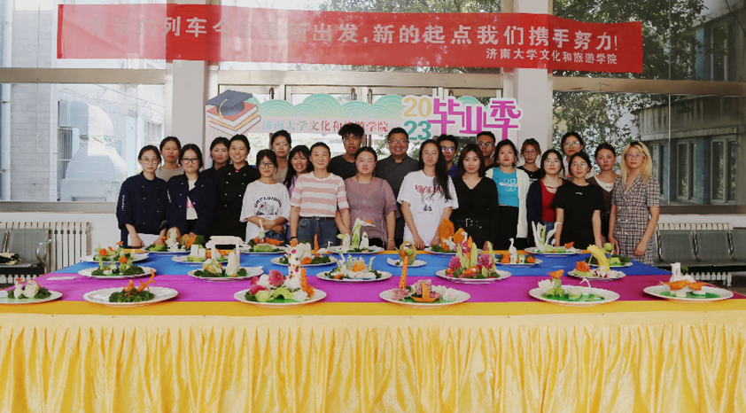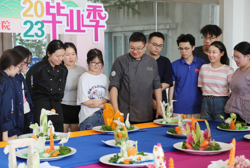 6月20日上午,MG冰球突破网站烹饪与营养教育专业大二学生于文旅楼大厅摆设食品雕刻展台,为2023届毕业生们送上最诚挚的祝福。各种寓有美意的食品展台齐聚一堂,供大家观赏。