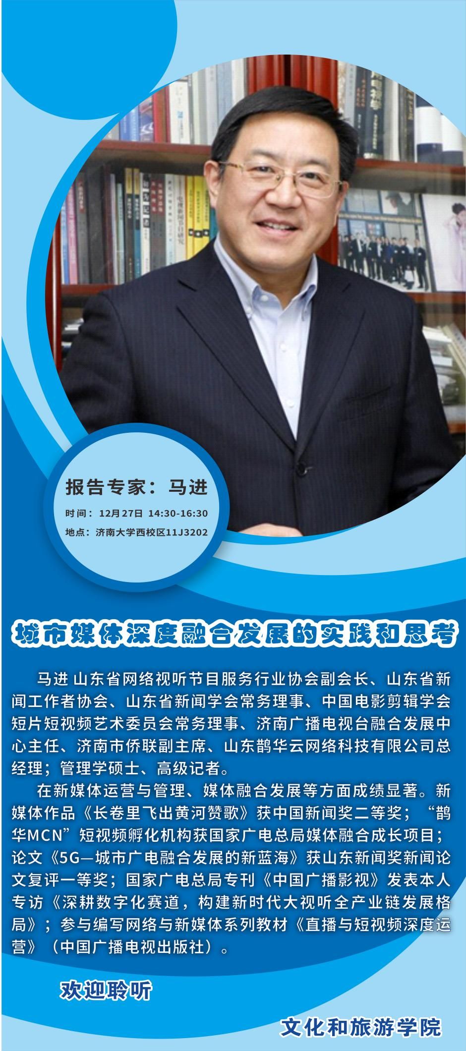 12月27日下午,MG冰球突破网站MG冰球突破网站邀请山东省网络视听节目服务行业协会副会长、济南广播电视台融合发展中心主任、山东鹊华云网络科技有限公司总经理马进开展了关于《城市媒体深度融合发展的实践和思考》的专家讲座,会议由副院长马修伦主持,文化经营管理系师生共计100余人参加讲座。