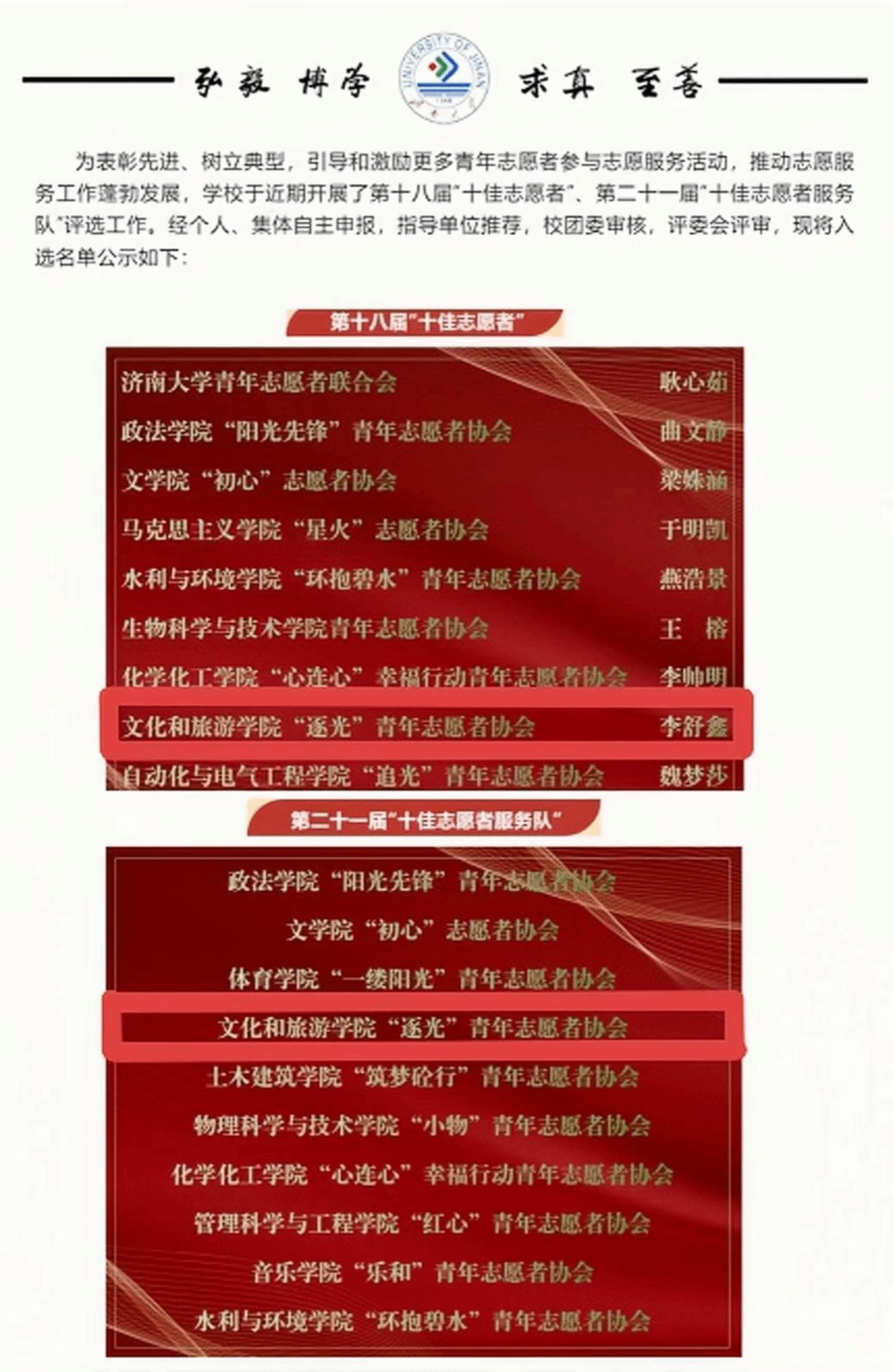 近日,MG冰球突破网站第二十一届“十佳志愿者服务队”和第十八届“十佳志愿者”评选结果公布。MG冰球突破网站MG冰球突破网站“逐光”青年志愿者协会与志愿者李舒鑫蝉联“十佳志愿者服务队”与“十佳志愿者”。荣誉称号 “逐光”青年志愿者协会自2019年成立以来,在学院党委的领导下,广泛参与敬老爱幼、社区服务、文化宣传等各类志愿服务活动。这一批在工作中有理想、敢担当、能吃苦、肯奋斗的新时代志愿者,以有组织力、服务力和凝聚力的志愿者协会为依托,整合校内外志愿服务资源,打造具有文旅特色的高质量志愿服务项目,与齐鲁晚报·齐鲁壹点联手推出名泉云支教、防治荒漠化公益课等品牌公益活动,开展“人间最美四月天”活动,同时还作为重要后勤保障辅助第三届儒商大会顺利举行等。协会志愿者以专业态度开展各类志愿服务活动,用高质量行动成果造福社会。