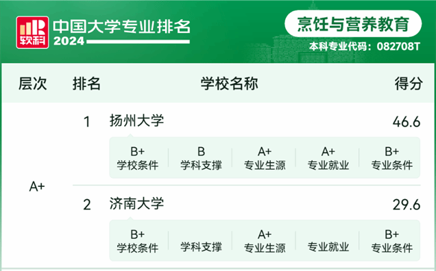 日前,高等教育专业评价机构软科正式发布“2024软科中国大学专业排名”,排名包括810个专业,每个专业榜单发布的是所有开设该专业的高校中排名位列前50%的高校,共有1103所高校的31414个专业点上榜。MG冰球突破官网烹饪与营养教育专业成功上榜A+专业,位列全国第二名。