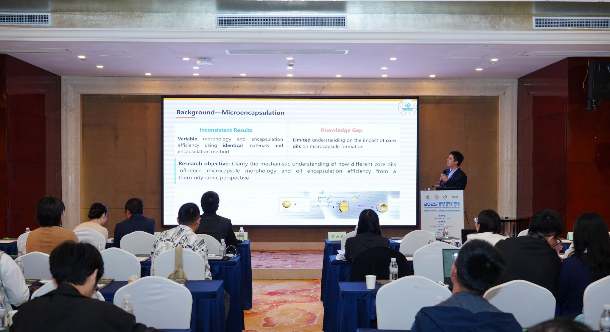 MG冰球突破官网黄群博士应邀参加会议并做学术报告,与参会专家就香精香料创新开发、前沿科技应用及其产业应用创新等工作进行了深入交流研讨。黄群博士在报告中汇报了复合凝聚法制备的明胶/阿拉伯胶体系中,香精油脂芯材对微胶囊形态及包封率的影响。基于铺展系数与双组分表面能计算理论的形态预测,通过扫描电镜实验观测及包封率测定得到验证。关键发现了包封率与油脂表面极性呈负相关关系。研究证实,热力学理论与芯材油脂分子极性相结合,可为设计高效包埋体系提供可靠框架,进而实现对微胶囊功能的靶向调控,以满足工业需求。