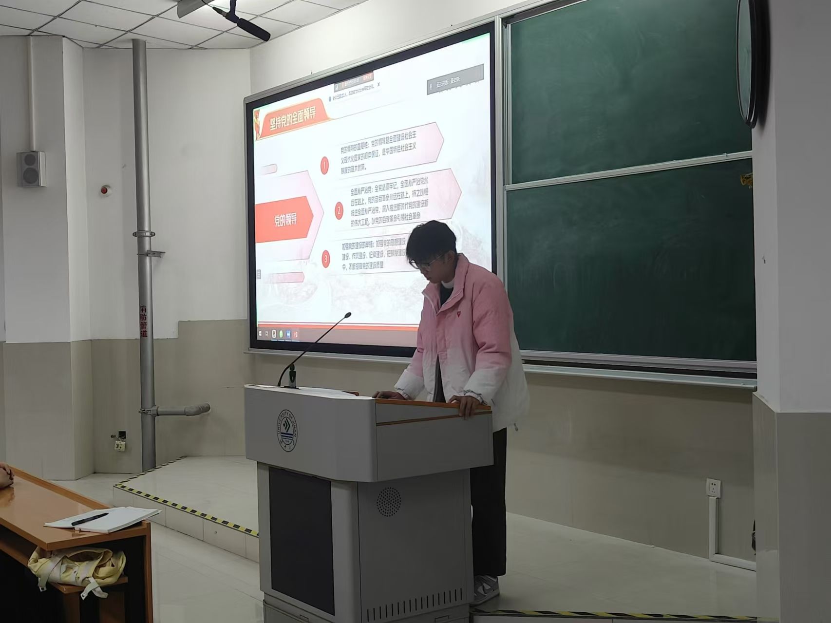 杨鑫祎同学特别提到了新时代十年的伟大变革,通过展示我国建成世界最大的高速铁路网、高速公路网等基础设施建设的重大成就,让学子们深刻感受到国家的发展和进步,增强了对中国特色社会主义道路的自信。同时,号召全体团员,新时代十年的伟大变革来之不易,要增强忧患意识、坚持底线思维,发扬斗争精神,主动应对各种风险挑战,勇于进行斗争。
