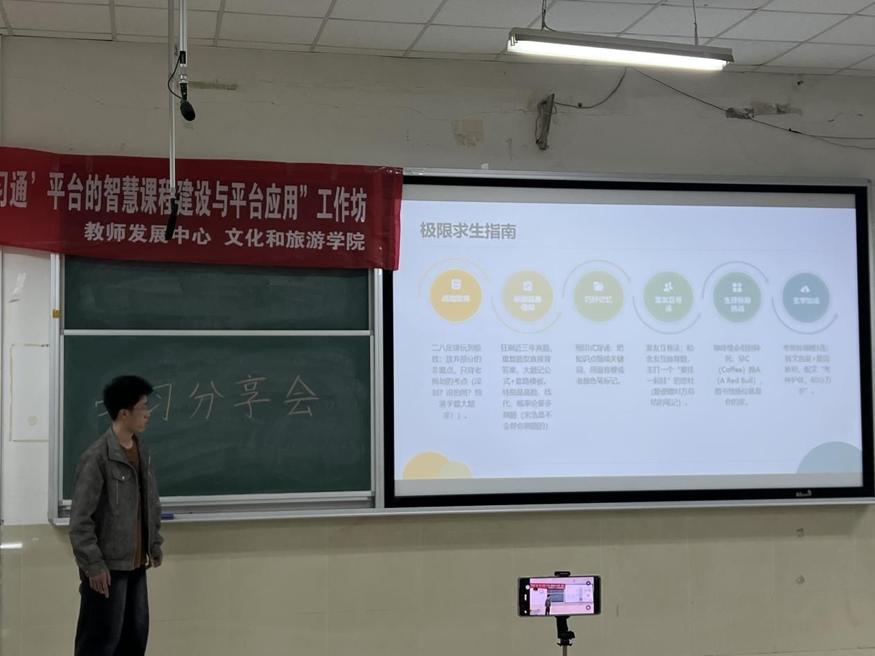 李同学从学习目标、时间管理、个性化学习方法、排除干扰、复习策略等五方面展开,为同学们一一解答疑问,还向同学们分享了网上学习的平台、ppt制作的资源,并且强调了一二类赛事的重要性。