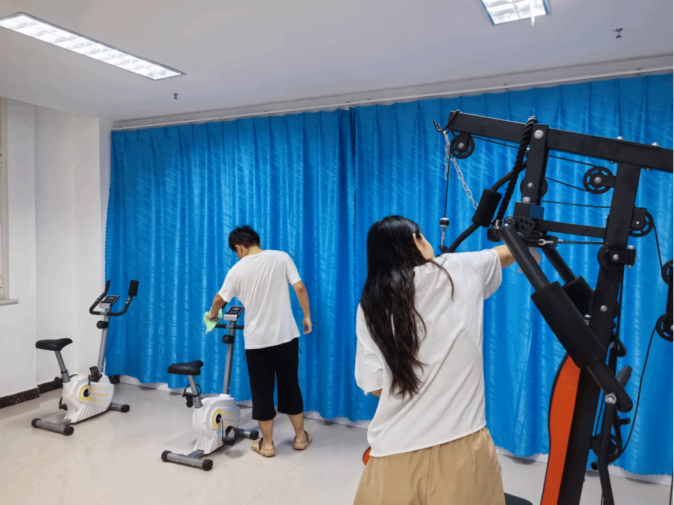 在康复训练区,实践团成员们发现部分康复器材因长期使用而积灰,可能影响使用体验和卫生安全。于是,他们主动拿起抹布、消毒喷雾等工具,对各类康复器材进行了全面清洁与维护。队员们分工明确,李嘉豪、陈颖负责擦拭上肢训练器、下肢康复机等大型设备,仔细清理器械关节处的灰尘;李雨薇则专注清洁沙盘、平衡板等小型器具,确保每一个角落都干净整洁。在清洁过程中,他们还细心检查器材的功能状态,发现松动的螺丝或磨损的部件及时向药店工作人员反馈,确保器材的安全使用。队员们不仅用实际行动维护了康复环境的整洁,更通过这一过程学习了康复器材的基本功能和使用注意事项,对医药服务有了更深入的理解。