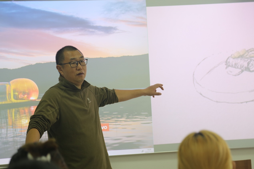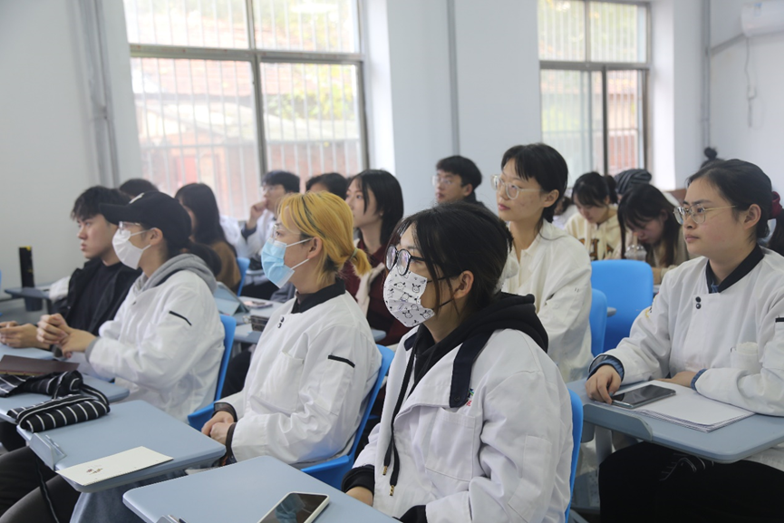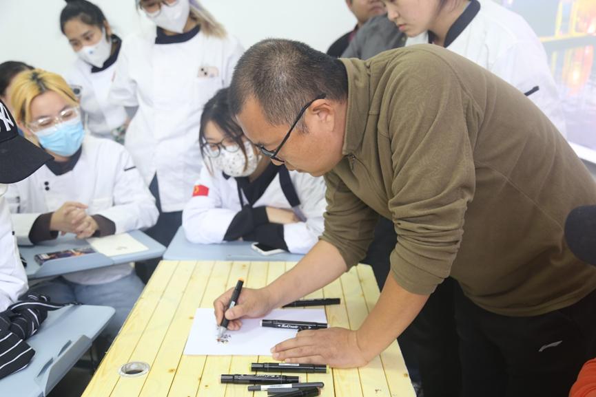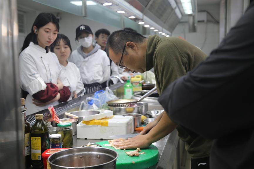 本次艺术烹饪手绘表演活动由中国西餐烹饪大师、餐饮业国家一级评委郭善恒老师为同学们讲解。活动刚开始,郭善恒老师讲述了餐饮行业中手绘的重要性,呼吁大家进行菜品创新,使菜品朝着精致化、定制化的方向发展。接下来,同学们互相传看了郭善恒老师的手绘作品,大家对精美的手绘纷纷表示赞叹。在郭善恒老师现场手绘菜品的过程中,同学们也积极地询问老师和预制菜、摆盘等相关的问题。活动最后,郭善恒老师在烹饪实验室边做边讲解了两道菜系,教授给了同学们独特的烹调技巧。
