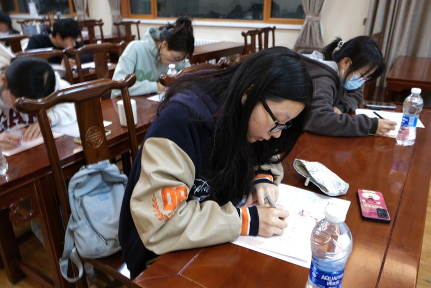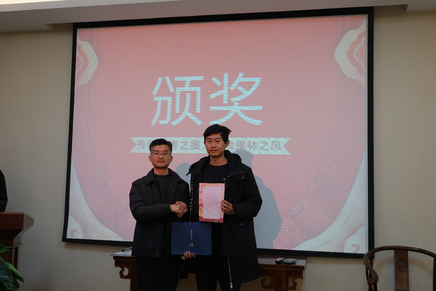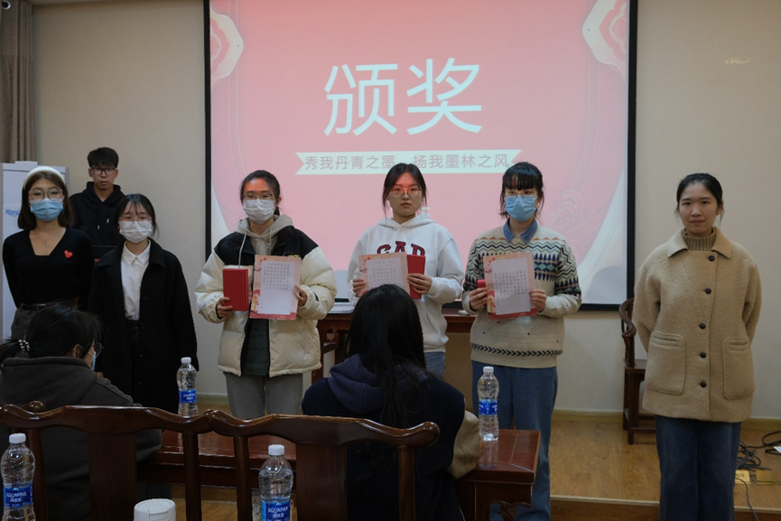 主持人宣布比赛开始后,同学们静心书写,逆锋起笔、中锋行笔、回锋收笔,一撇一捺,文字古韵与笔尖点墨处幻化成彩蝶翩然而起,同学们的每一次提笔都仿佛是与文字的灵魂交流。书写结束后,评委集体打分,主持人宣布此次比赛的结果。MG冰球突破网站吴鲁锋老师和杨萍老师对此次活动进行了总结讲评。吴鲁锋老师从六艺讲起,提出应该重视书法书写。杨萍老师则赞扬了此次活动的比赛形式,鼓励大家潜心研究书写、重视书写。最后,评委为选手颁奖,选手们与评委进行合影留念。