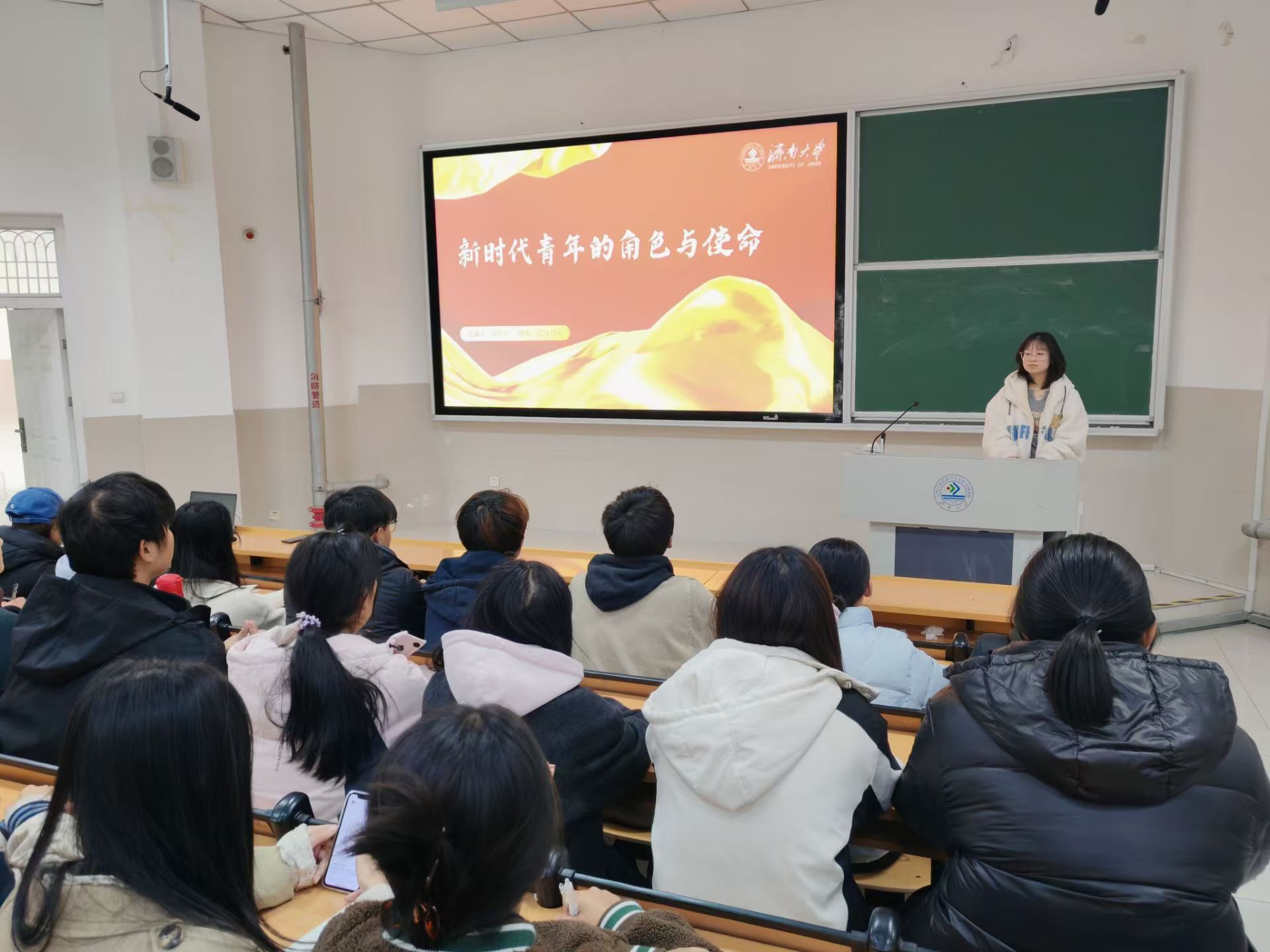 主讲人武欣欣以"新时代风云变幻,挑战与机遇并存"为引。告诫新青年们要提高思想觉悟,保持对国家政治方向的高度敏锐,坚定政治立场,积极响应党的号召。青年们要做到心中有人民,增强社会责任感,积极关心社会问题,投身公益事业,为社会发展贡献青春力量。论及创新与协作时,武欣欣同学指出,青年应摒弃传统思维,创新进取,在各自领域中发光发热。深刻践行团队协作精神,在相互配合、沟通中,感受集体主义的魅力。如今,中国乃至世界都正经历着百年之未有大变局,青年们既要有家国情怀,也要有人类情怀,秉持四海一家、天下为公的理念,为世界发展贡献中国智慧。