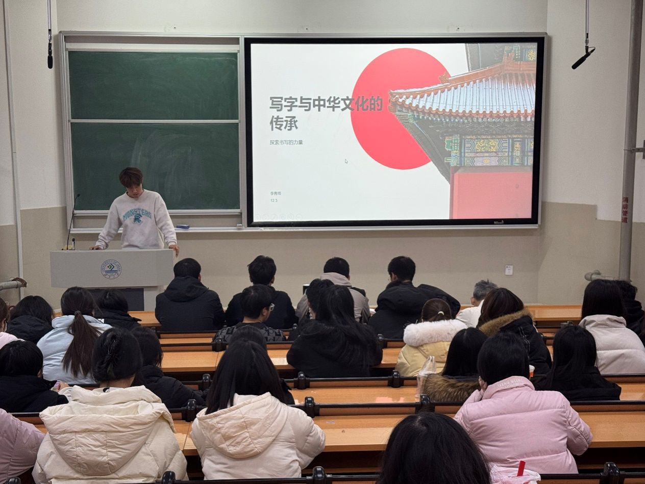 活动中,主讲人李青雨同学以汉字书写为主题展开分享。他详细阐述了写字的益处,指出写字不仅能够锻炼耐心与专注力,还能提升个人的文化修养与审美水平。李青雨同学结合自身经验,向同学们介绍了汉字书写的基本方法,包括正确的握笔姿势以及字体结构的把握等,并通过播放相关视频资料,生动形象地帮助同学们理解汉字书写的要点与精髓。