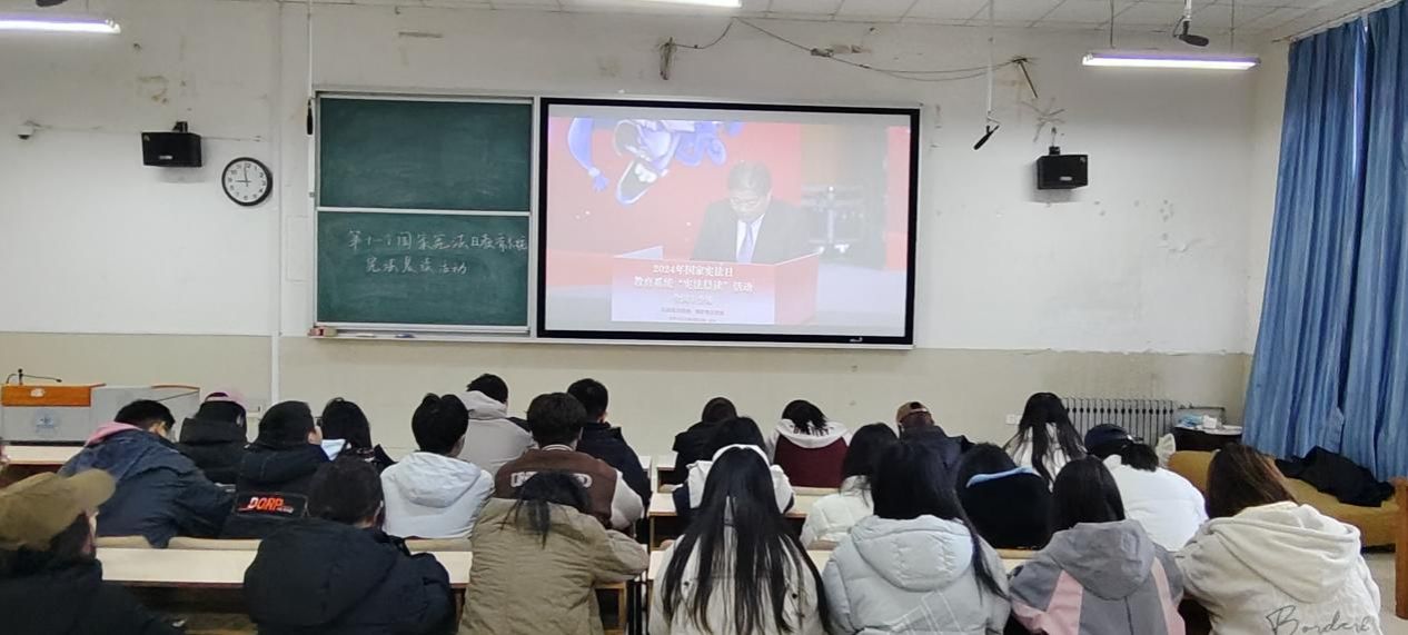 为全面贯彻党的二十大精神以及党的二十届二中、三中全会精神,坚定不移地以习近平新时代中国特色社会主义思想为指引,深入学习贯彻习近平法治思想,进一步弘扬宪法精神,全面增强学生的法治意识,在第11个国家宪法日和第7个宪法宣传周到来之际,MG冰球突破网站于12月4日在阶梯教室组织学生观看“宪法晨读” 直播活动。