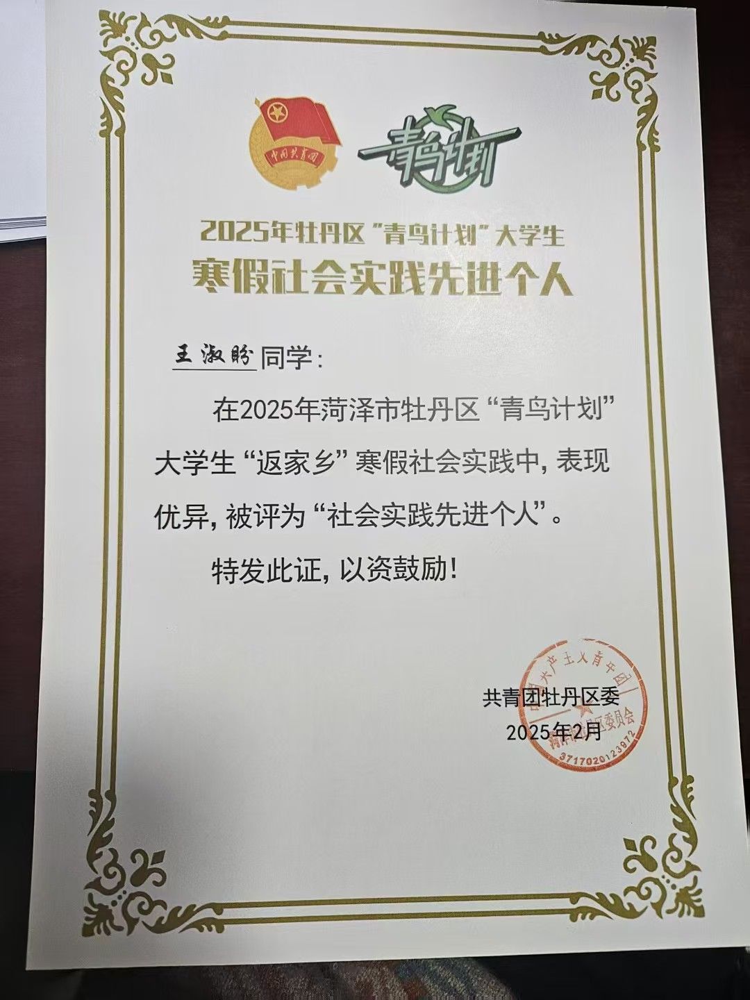 寒假期间,MG冰球突破网站传媒2302王淑盼同学通过“青鸟计划”平台,在菏泽市牡丹区胡集镇人民政府镇团委开展为期14天的寒假社会实践,以专业行动服务家乡发展。