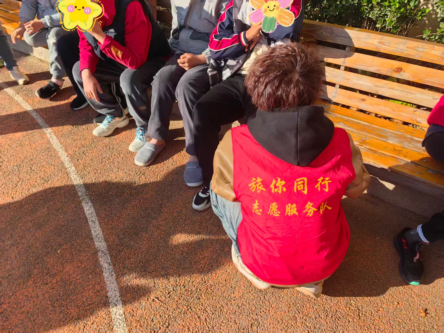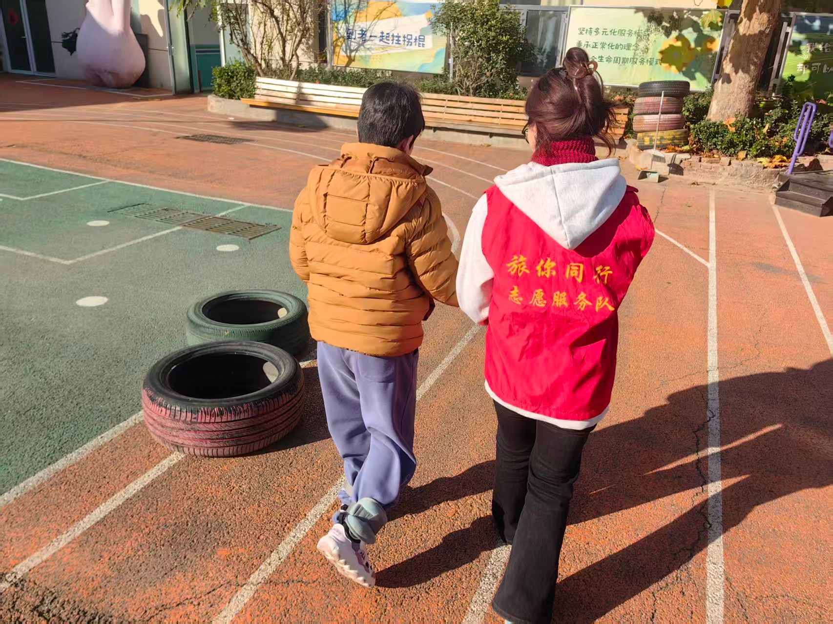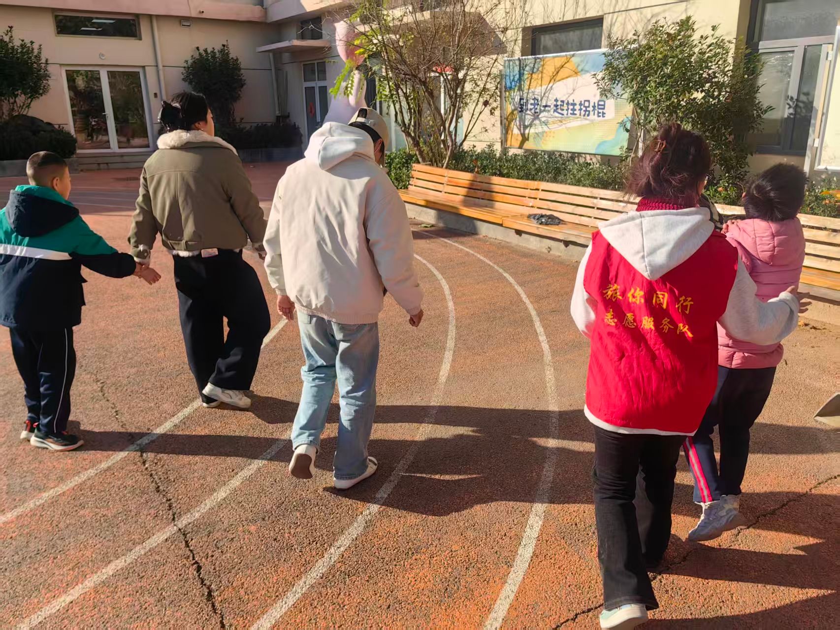 暖阳之下,微风轻拂,志愿者与孩子们手牵手漫步于康复中心的操场。没有刻意的流程设计,没有繁杂的活动安排,只是循着孩子的节奏缓缓前行,任阳光洒在彼此肩头,将无声的陪伴化作最动人的语言。志愿者们放下节奏,俯身倾听,用眼神回应每一个细微的举动,用微笑接纳每一次稚嫩的表达。这一场慢下来的漫步,不仅让孩子们在自然中放松身心,更让他们在平等的互动中放下戒备,悄然拉近与世界的距离;志愿者们也在这份纯粹的陪伴里,读懂了公益不是单向的付出,而是彼此温暖的双向奔赴。