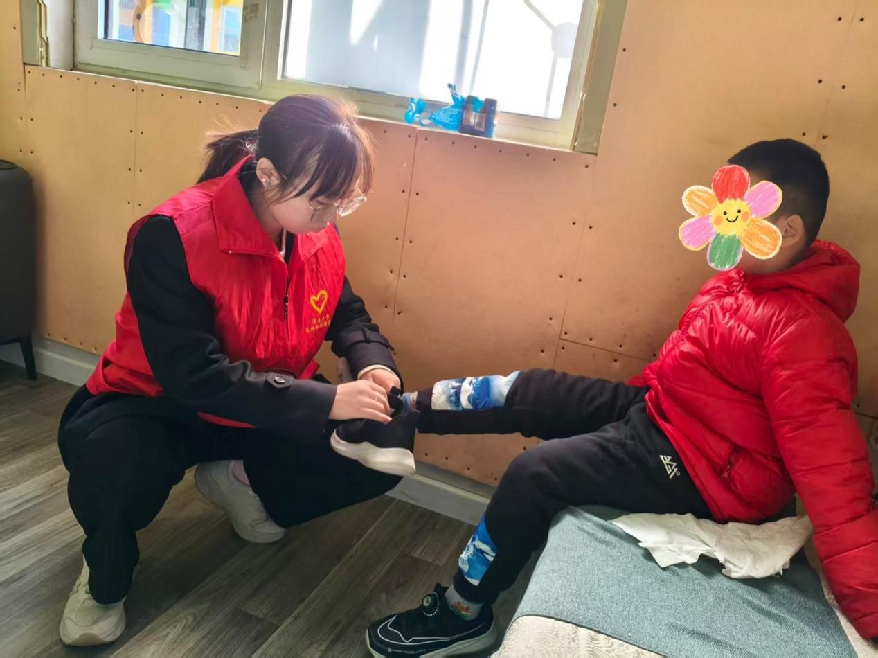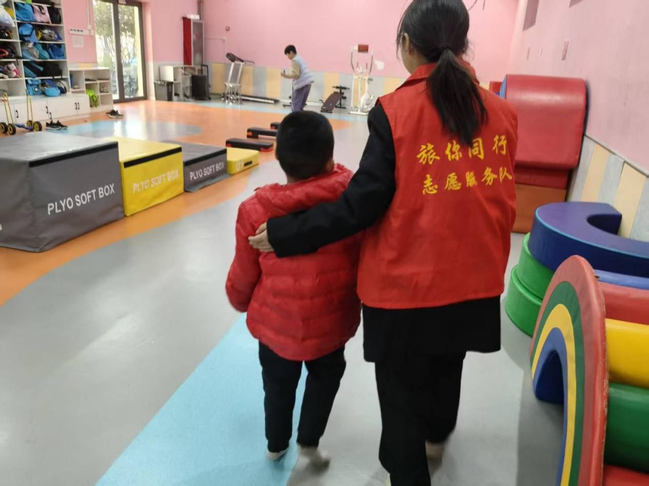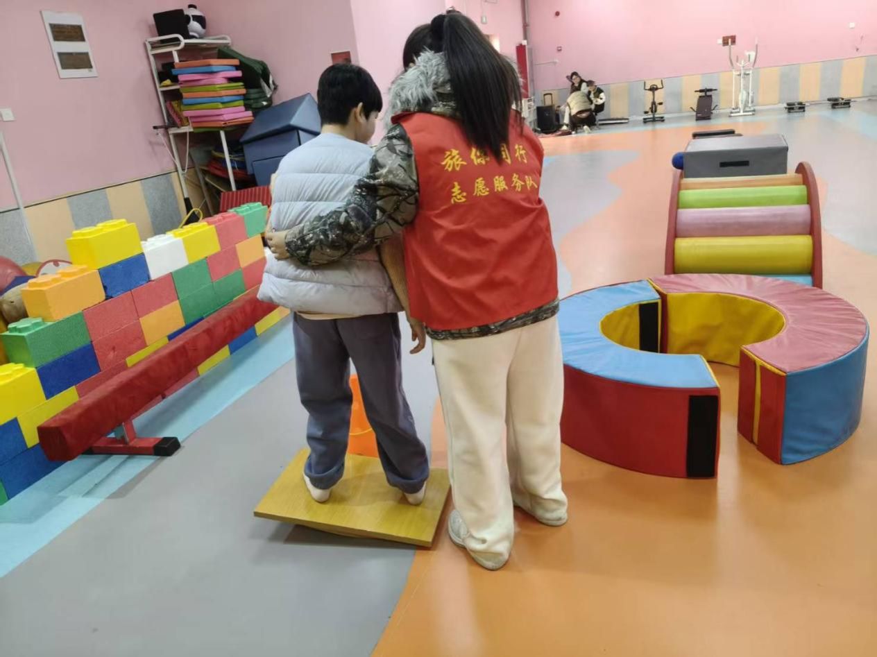 志愿者们以一对一专属陪伴模式,化身孩子们贴心的“守护者”,将细致关怀融入每一个日常瞬间。他们屈膝俯身,用温和的话语耐心交流,以专注的倾听回应每一个稚嫩表达;细致照料生活起居,轻轻为孩子们递水喂水,温柔协助穿好鞋袜,用轻柔动作传递暖意,用耐心陪伴驱散不安。同时,志愿者们结合孩子的康复需求,一对一辅助开展康复训练,手把手引导练习平衡能力,每一个帮扶动作都细致入微,每一次鼓励都坚定有力,让孩子们在陪伴中感受关爱,在训练中收获进步,让温情浸润成长的每一刻。