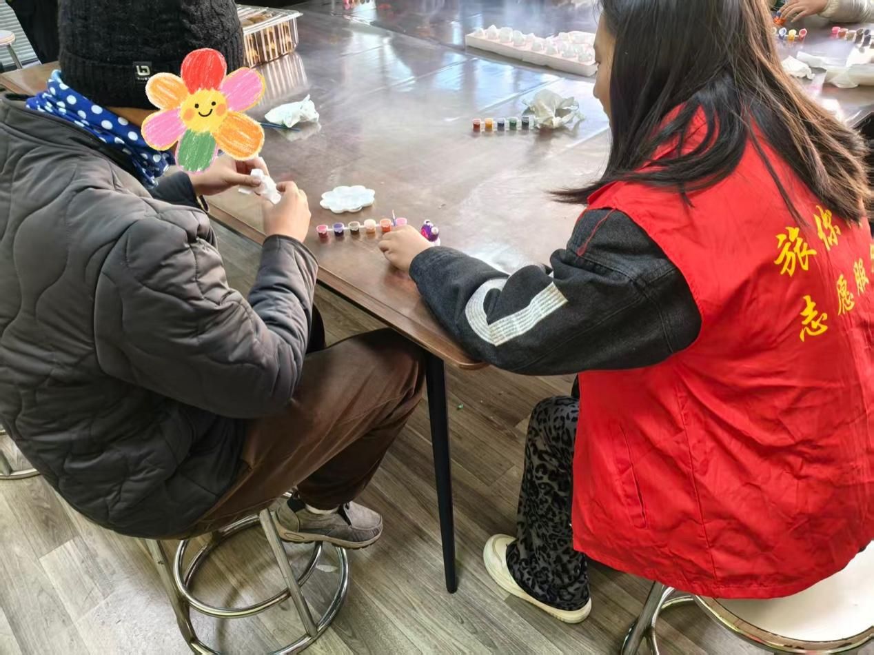 活动中,志愿者们化身耐心的“引导者”,与孤独症儿童围坐一堂,共赴一场石膏娃娃的创意美学之约。志愿者们俯身倾听,耐心引导,手把手教孩子们握笔、调色,从淡雅底色到灵动纹路,从色彩搭配到细节勾勒,每一个动作都轻柔细致,每一句鼓励都温暖入心。孩子们的小手在陪伴中渐渐舒展,原本素净的石膏娃娃,在他们的笔下褪去单调,被赋予鲜活色彩与独特创意。这不仅是一场艺术创作,更是一次专注力、动手力与审美力的悄然滋养,让孩子们在色彩的世界里收获自信,在创作的乐趣中感受温暖。