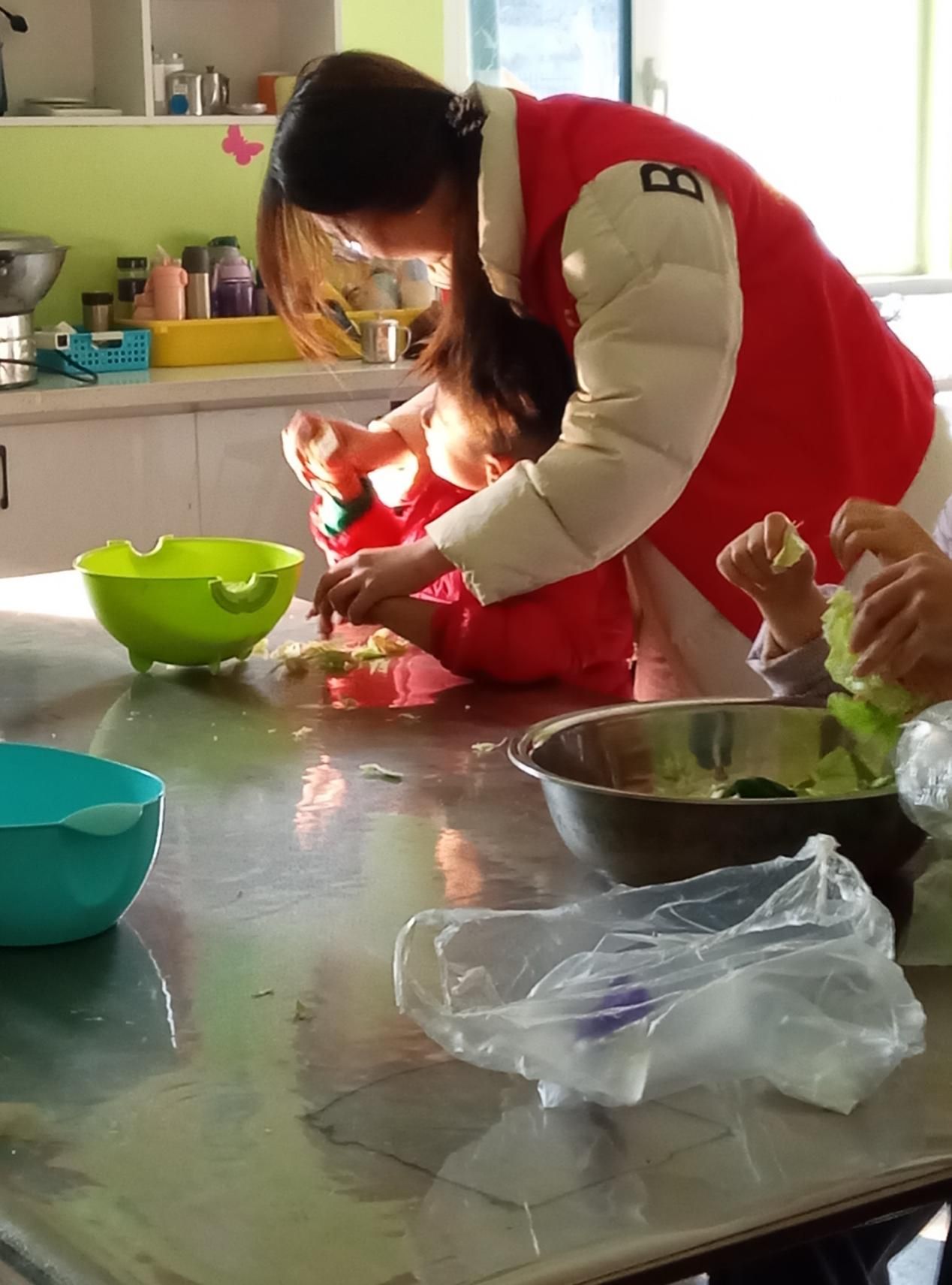 为帮助孩子们贴近生活、感知日常,志愿者们化身“生活向导”,带着孩子们走进社区超市,开启一堂生动的生活实践课。从挑选新鲜的午餐食材,到认识琳琅满目的蔬果米面;从学习称量食材的重量,到理解分量的计量概念,志愿者们循循善诱,将生活常识融入点滴讲解。返程后,大家一同围在餐桌旁,开启食材预处理时光——志愿者们手把手教孩子们撕包菜、理菜叶,看着孩子们稚嫩的小手认真地摆弄食材,在实践中慢慢掌握自主生活的小技能,在烟火气中读懂生活的温度,在动手实践中收获成长的喜悦。