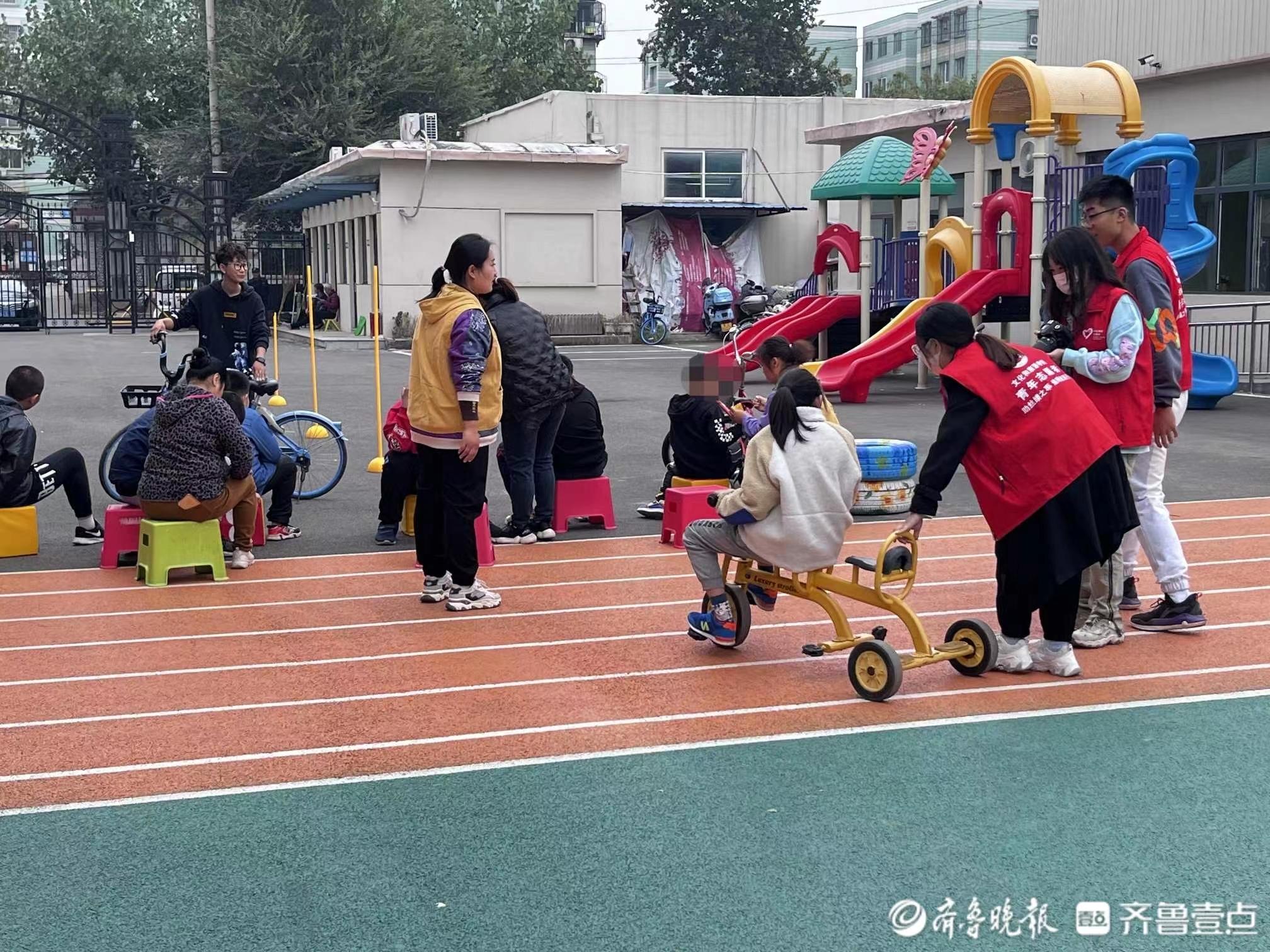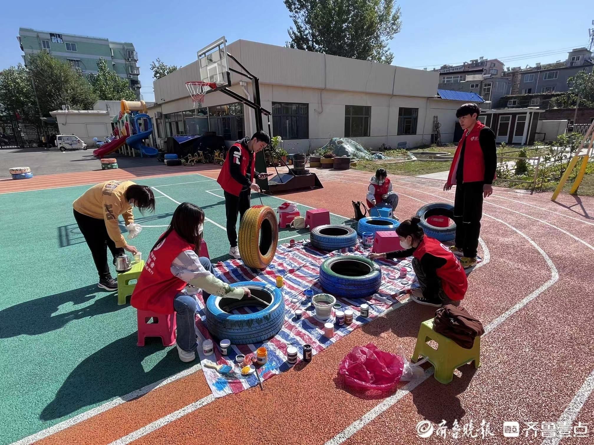 大学生志愿者们在指导老师的带领下和孩子们一起画轮胎、拍视频、学骑自行车,甚至教他们打篮球。