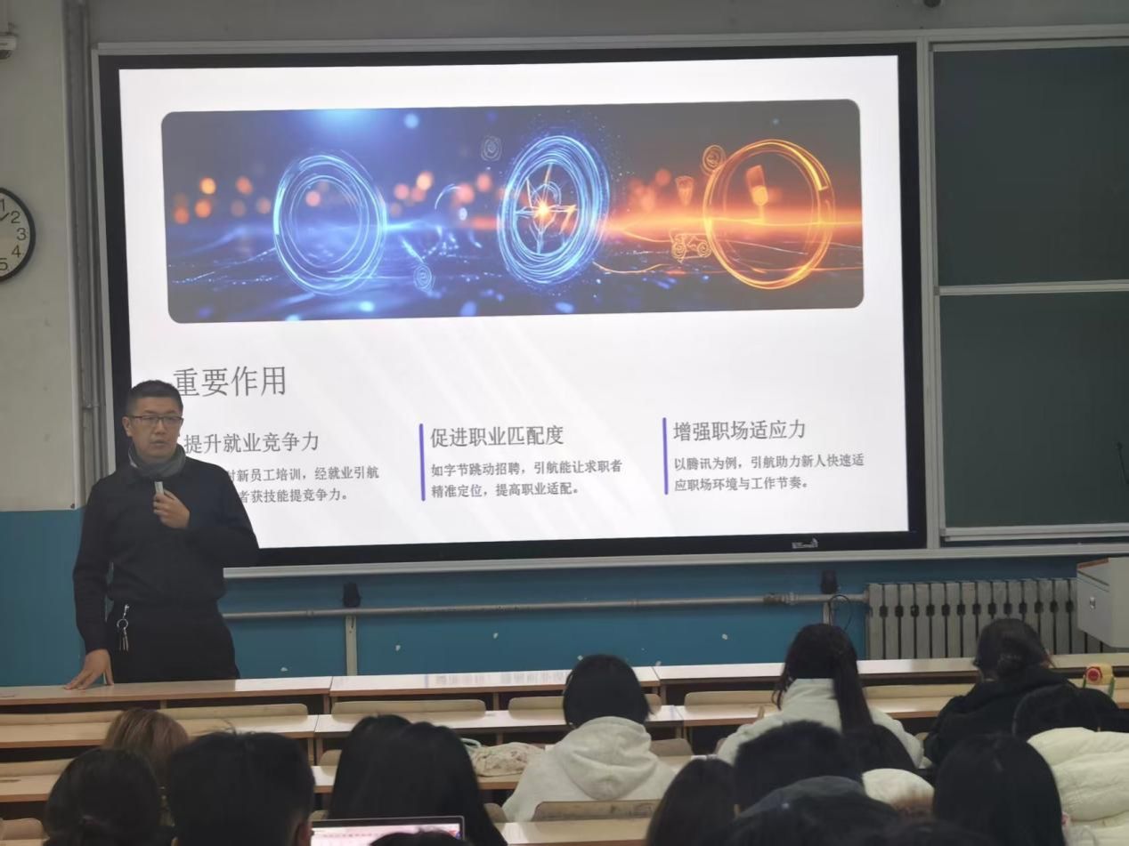 在阐述就业引航的意义时,主讲人吕龙飞老师指出,该计划不仅能有效提升学生的就业竞争力,还能帮助大家更精准地匹配职业方向,增强职场适应能力。通过引入华为、字节跳动、腾讯等企业的实例,生动说明了就业引航在实战中的重要作用。