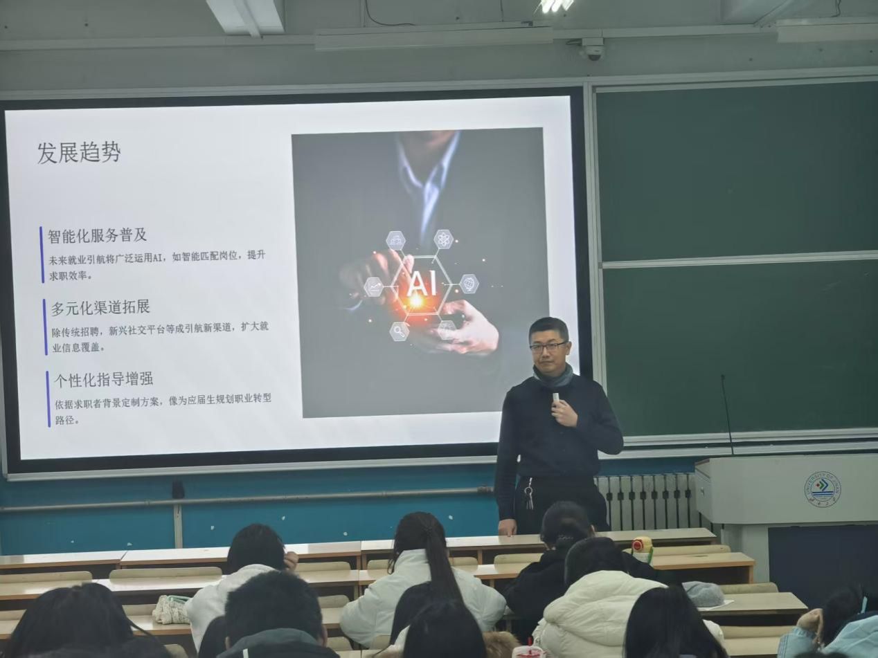宣讲会首先介绍了“就业引航”的基本概念。它如同职场中的“指南针”,为学生提供精准的就业导向;同时贯穿求职全程,从准备阶段到入职适应,实现“全程护航”;并通过整合校内外招聘、培训等资源,搭建起高效的就业信息平台。
